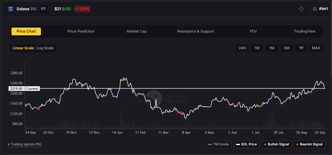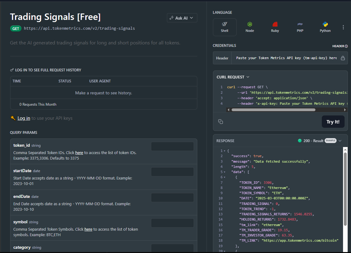 Timing makes or breaks every trade. The crypto trading signals API from Token Metrics lets you surface bullish and bearish calls directly in your product—no spreadsheet wrangling, no chart gymnastics. In this guide, you’ll hit the /v2/trading-signals endpoint, display actionable signals on a token (e.g., SOL, BTC, ETH), and ship a conversion-ready feature for bots, dashboards, or Discord. Start by creating a key on Get API Key, then Run Hello-TM and Clone a Template to go live fast.