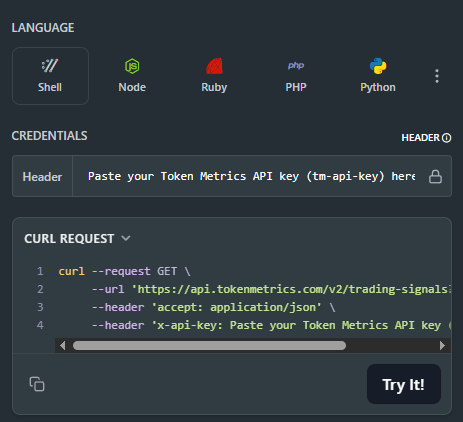 You can find the cURL request for Crypto Trading Signals in the top right corner of the API Reference. Use it to access the latest signals!