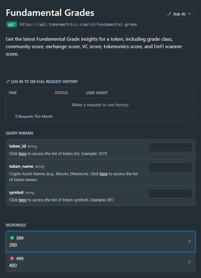 Most traders chase price action; Fundamental Grade API helps you see the business behind the token—community traction, tokenomics design, exchange presence, VC signals, and DeFi health—consolidated into one score you can query in code. In a few minutes, you’ll fetch Fundamental Grade, render it in your product, and ship a due-diligence UX that drives trust. Start by grabbing your key at the Get API Key page, Run Hello-TM to verify your first call, then Clone a Template to go live fast.