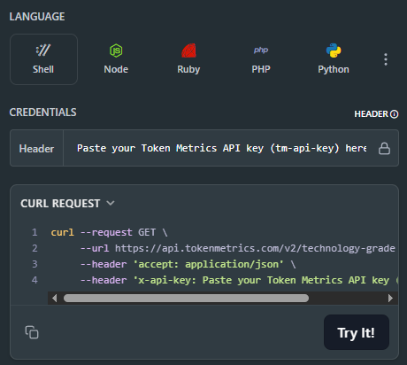 For the Technology Grade information, check the top right of the API Reference. You'll find the cURL request to connect effortlessly.