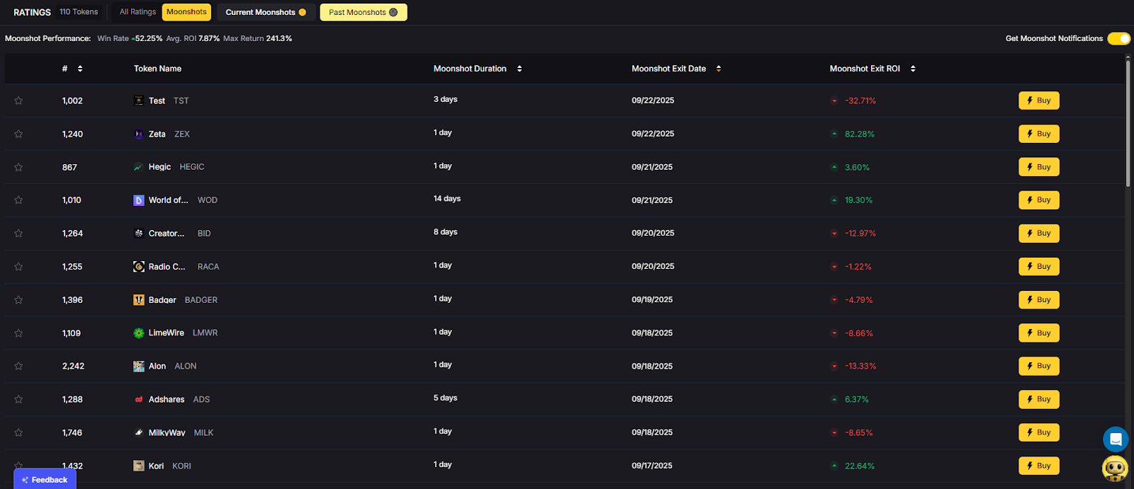 - Moonshots tab with Badges (Bullish, Grade 80+, Momentum).