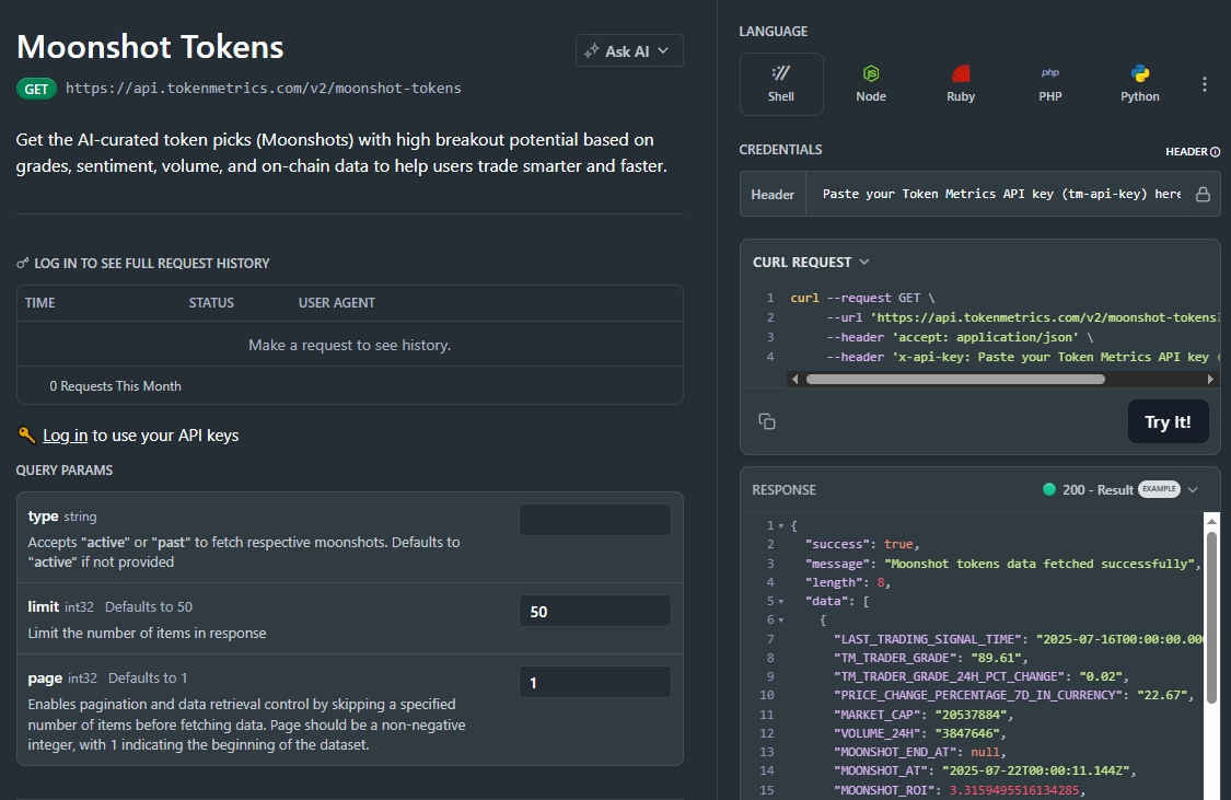 The biggest gains in crypto rarely come from the majors. They come from Moonshots—fast-moving tokens with breakout potential. The Moonshots API surfaces these candidates programmatically so you can rank, alert, and act inside your product. In this guide, you’ll call /v2/moonshots, display a high-signal list with TM Grade and Bullish tags, and wire it into bots, dashboards, or screeners in minutes. Start by grabbing your key at Get API Key, then Run Hello-TM and Clone a Template to ship fast.
