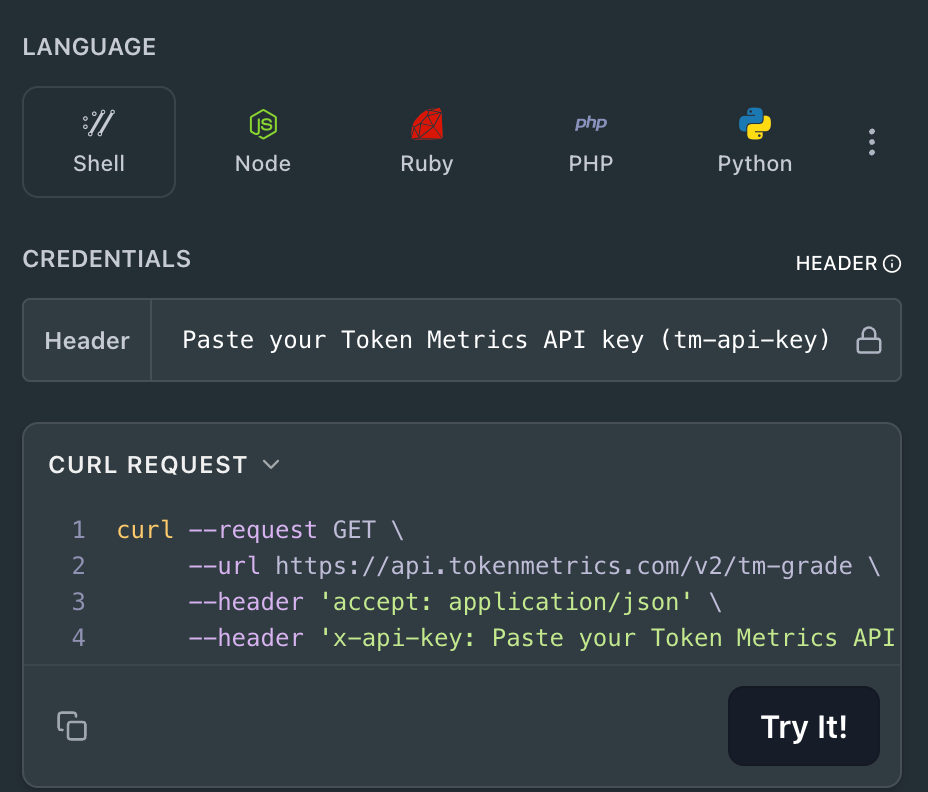 Most traders chase price action; Fundamental Grade API helps you see the business behind the token—community traction, tokenomics design, exchange presence, VC signals, and DeFi health—consolidated into one score you can query in code. In a few minutes, you’ll fetch Fundamental Grade, render it in your product, and ship a due-diligence UX that drives trust. Start by grabbing your key at the Get API Key page, Run Hello-TM to verify your first call, then Clone a Template to go live fast.